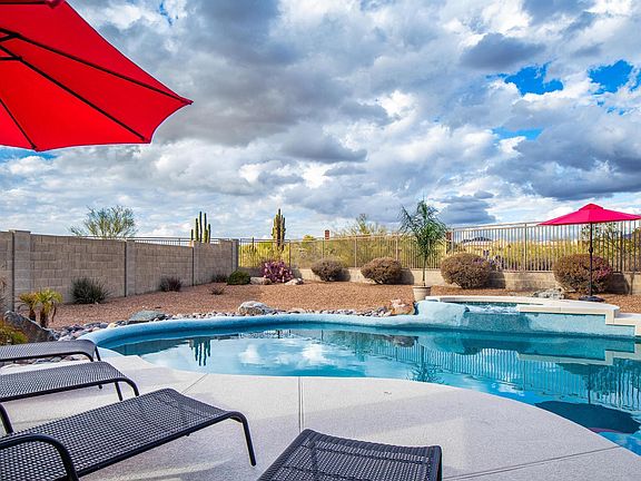 Furnished! GREAT FLOORPLAN, 3 FULL BATHS, 4 BEDROOMS, ENORMOUS HEATED POOL AND SPA! GORGEOUS VIEWS FROM ALL LEVELS WITH A DECK! HUGE LOT WITH NO HOMES BEHIND YOU! ONLY DESERT, SO PRIVATE! BIG FAMILY ROOM W/SECTIONAL COUCH OPENS TO KITCHEN WITH NEW GRANITE AND SEATING FOR 6 AT ISLAND! MASTER PLANNED COMMUNITY WITH AQUATIC PARK WITH LAZY RIVER, SLIDES, SKATE BOARDING PARK, GOLF COURSE, 2 COMMUNITY CENTERS WITH B-BALL, TENNIS, PICKLEBALL, HIKING TRAILS GALORE! SO CLOSE TO FRWYS-JUST MINUTES AWAY! CLOSE TO KIERLAND , SCOTTSDALE QUARTER! WMPO, WESTWORLD, SPRING TRAINING!