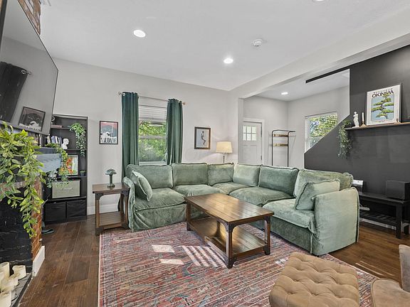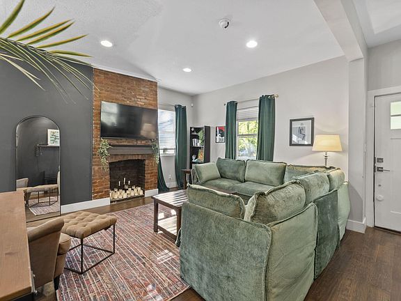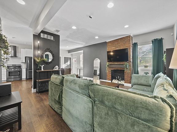 The open floor plan features black stainless appliances, granite countertops, an exposed brick fireplace, hardwood floors, and a first-floor half bath with laundry hookup. Enjoy a newly fenced outdoor space with a parking pad for easy off-street parking.