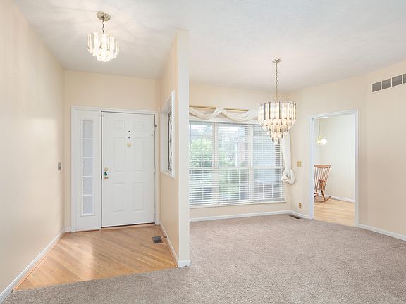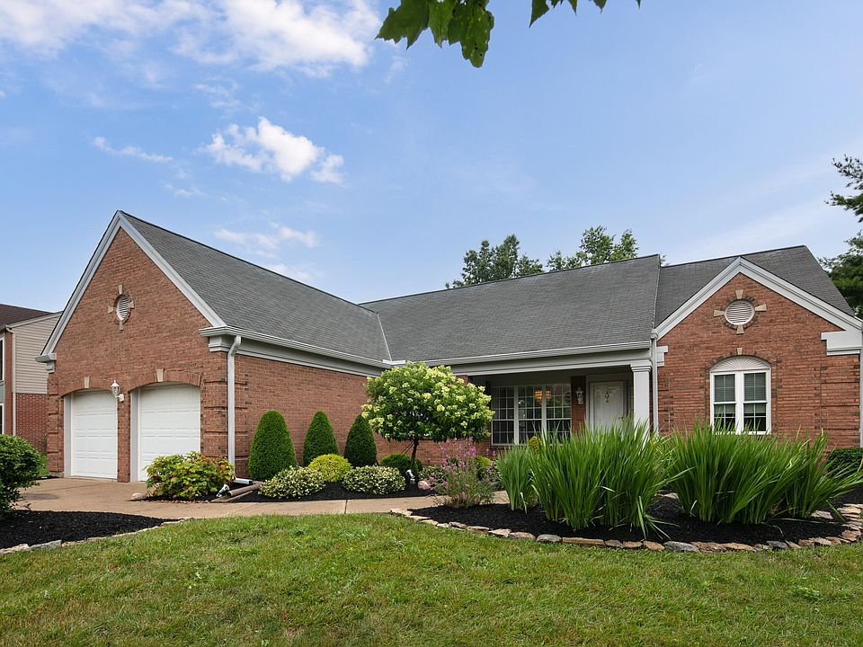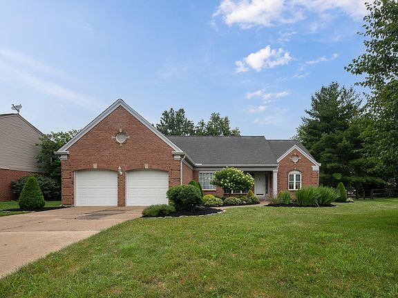 This former model home is conveniently located off Hopeful Church Road in the Persimmon Grove subdivision in Florence, Kentucky. The well-maintained, all brick home is situated on a beautifully landscaped quarter of an acre lot just 3 doors down from the neighborhood pool. Outside, you'll find a covered front porch, spacious back patio, landscaped and fenced backyard, separated garage doors w arched brick soldiering & keystones and what appears to be a newer roof. You'll love this split floor plan including a double-sided fireplace with built-in bookshelves in the living room and shelves and cabinets in the formal dining. The kitchen offers white cabinets, white appliances a sizeable pantry and hardwood floors which could be inexpensively extended into the rest of the common areas and hallways. Granite countertops are throughout. The home offers many double hung Champion Windows throughout for an abundance of natural light. Great primary bath tiled shower option awaits. But wait, there's more. This home offers a partially finished partial basement as well!