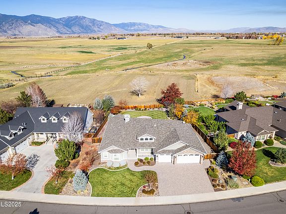 Not a single detail was overlooked in this custom-built masterpiece located in the prestigious Rocky Terrace Subdivision. This thoughtfully designed residence offers a desirable split floor plan with 4 bedrooms, 3.5 baths, and a 3-car garage on nearly half an acre—backing to open ranch land for added privacy and sweeping views. As you step inside, you're greeted by beautiful engineered hardwood flooring that flows throughout the main living areas. The living room features soaring vaulted ceilings, a ceiling fan, and a cozy gas log fireplace, creating the perfect gathering space. From the dining area, enjoy your morning coffee while taking in the breathtaking Sierra Mountain Range. The kitchen is a chef's delight with a breakfast bar, an oversized walk-in pantry, soft-close cabinets and drawers, and elegant lighting in and under the cabinetry with dimmers. A gas cooktop and a stunning Walker Zanger Marquis Octagon ceramic tile backsplash complete this stylish culinary space. The spacious laundry room offers abundant storage with built-in cabinets, a sink, and even a second pantry. The primary suite is a true retreat, featuring White Carrara Marble countertops, heated floors, and a jetted soaking tub for ultimate relaxation. A second primary suite also includes heated bathroom floors, ideal for guests or multi-generational living. Step outside to your private backyard oasis—perfect for unwinding under the arbor, gathering around the fire pit, or simply enjoying the endless Sierra views and watching the cows graze beyond the fence line. This Rocky Terrace gem truly captures the essence of Northern Nevada living—where comfort, craftsmanship, and natural beauty come together.