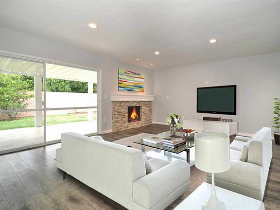 This beautiful newly remodeled Chatsworth home rest on a quiet street and is fronted by mature trees. New windows, a new roof, and freshly painted interior and exterior make this picture perfect home feel brand new. Inside you will find an open floor plan with a kitchen that offers gleaming quartz counters with custom glass back splash, stainless steel appliances and large stainless steel sink. The home is blanketed with new wood/laminate flooring that accents the custom cool paint tones. The living room offers plenty of space to entertain and features a custom gas fireplace with stacked stone hearth. The Master Bedroom is a great place to unwind with attached bath offering a custom stall shower w/large subway tile, dual vanity w/soft close doors and custom tile flooring. There are 3 other great size bedrooms and hall bath that is a show piece all on it's own, with custom subway tile surround with accent glass border, single vanity with soft close doors and tile flooring. Other features include, LED lighting, Pendent lighting in kitchen, smooth ceilings, Freshly painted white cabinets and front door, large indoor laundry room, good size rear yard with patio cover and grass area. Stop by today...this one won't last.