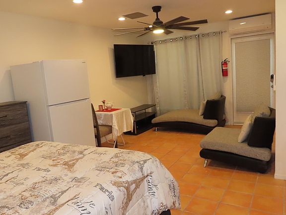 This fully furnished studio offers a private entrance and separate address, with all-new furnishings and appliances. Located in a safe, quiet neighborhood, the studio provides easy access to the 405 and 118 freeways and is conveniently close to public transportation, excellent schools, and major shopping centers like Costco, Walmart, Aldi, and Best Buy. It's also just minutes from California State University, Northridge (CSUN) and the Northridge Mall. Inside, the studio features a spacious kitchen with a large refrigerator, oven, microwave, coffee maker, tea maker, and garbage disposal. For entertainment, a 58" 4K Smart TV with cable is provided. The living area is comfortably furnished with a queen-size bed, chest of drawers, mirrored stand, chairs, and a large mirror. Comfort features include an independent AC unit with remote control, a large ceiling fan with remote control, and tile flooring. Energy-efficient elements include a French door with built-in blind shade and a water-saving toilet. The studio also features smart dimmer lights for complete lighting control and a secure keyless lock system. High-speed internet at 500 Mbps and trash service are included in the utilities. Outside, tenants have access to a washer and dryer located in a private yard with fruit trees and a BBQ area, perfect for relaxation and entertainment. Additionally, the studio has a separate 100-amp power meter and a separate gas meter. This pet-friendly property is available for both short-term and long-term leases. Cable Tv, High-speed internet (500 Mbps), and Trash are included as utilities.