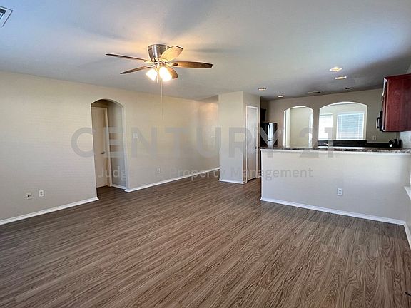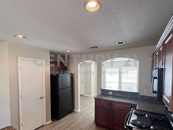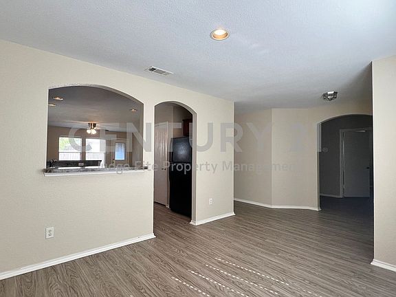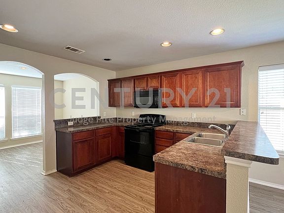 This beautifully maintained 3-bedroom, 2-bathroom home with a 2-car garage is located in the desirable Northwest ISD and offers a spacious, open layout ideal for modern living. Stylish wood plank flooring runs throughout the home, providing both charm and easy upkeep. The kitchen features rich wood cabinetry, striking countertops, and black appliances including a built-in microwave, dishwasher, stove, and disposal. The split-bedroom design offers added privacy, with the primary suite including a walk-in closet and ensuite bath with garden tub. Additional highlights include a full-size utility area with extra storage, a sprinkler system, and a fenced backyard for outdoor enjoyment. Located in a master-planned community that offers access to a sparkling pool and playground, this home blends comfort, convenience, and lifestyle amenities. Only 1 pet under 40lbs allowed with owner approval.