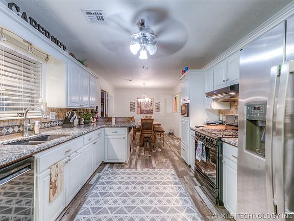This home has it all!!! Looking for a shop with living quarters? This home is one of a kind situated on 1 acre in Verdigris School District! It features 4 bedrooms, 2 full baths and 2 living areas with a large concrete patio. This property has a huge backyard great for entertaining and complete with a full sprinkler system. The shop is 50x80 and has 2 12x20 doors, 16x16 concrete safe room, a utility room complete with a washer and dryer and one full bathroom with tiled shower. The shop also includes a 700 square foot upstairs apartment complete with a large living area and bedroom. It also features a 50 gallon Ingersoll air compressor with lines and reels, 12 LED shop lights, 10x80 covered side and concrete drain with removable grates across the front of the shop. This property is truly one of a kind!