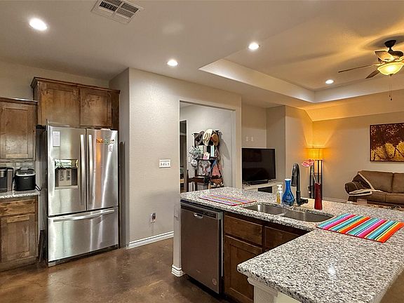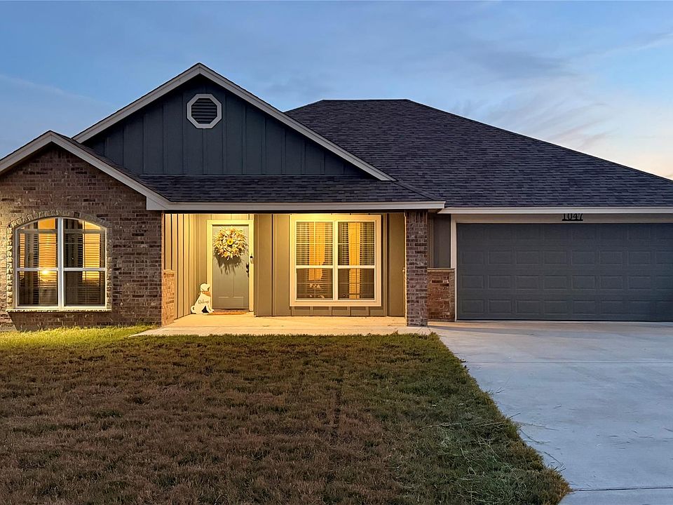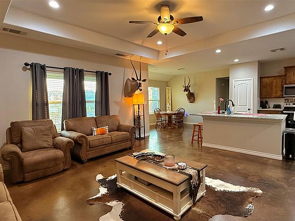 1047 Fieldstone Drive is located in a quiet cul-de-sac in the Stone Valley Subdivision. The home was constructed in 2022 with 3 bedrooms and 2 baths, dining room, a two car garage and utility room. The home perfectly combines style, comfort, and everyday living. The kitchen with an eat-in-bar feature elegant granite countertops that provide both function and style. Recessed tray ceilings in both the living room and primary bedroom create an open, airy atmosphere ideal for relaxing or entertaining. The large primary suite with a large walk-in closet and ensuite bath serves as a private retreat with dual sinks, a soaking tub, and large shower. Both bathrooms in the home have granite countertops and are designed for functionality and relaxation. Durable concrete floors flow throughout the home, offering a look that’s easy to maintain. An inviting front porch welcomes you and the back porch is great for gatherings with friends and family. You will appreciate the front and backyard having a sprinkler system for easy maintenance. This home that offers a great lifestyle along with comfort and convenience is a must see!