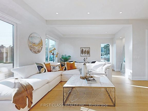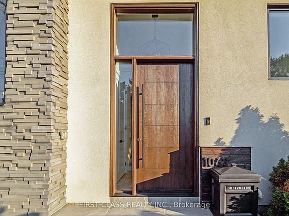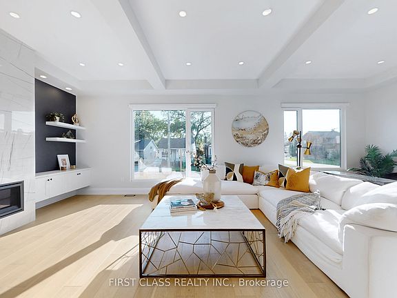 Welcome to 1047 Meredith Avenue, a stunning custom home in Mississauga's Lakeview community, just a short walk to the lake. Offering over 4,300 sq ft of total living space, this home was thoughtfully designed with 10-foot ceilings, a striking 8-foot front door, and a tall custom side entrance door leading to the basement. Inside, the open layout features a chef's kitchen with Wolf and Liebherr appliances, custom cabinetry, and Caesarstone counters, flowing into a dining room with a gas fireplace and a family room with elegant coffered ceilings. Expansive lift-and-slide patio doors open to the backyard deck, taller and heavier than typical sliders, a modern look in luxury homes. A glass wine display, modern glass staircase, and dramatic 3D feature wall create standout moments throughout the home. Upstairs you will find 4 spacious bedrooms, including a primary suite with a built-in closet and spa-like ensuite. The finished basement adds 2 bedrooms, a home theatre with projector, wet bar, tall ceilings, heated bathroom floors, and a walk-out to the yard, plus a second laundry. Additional features include dual laundry areas, integrated linear diffusers for a clean modern look, and custom blinds by the same installer who worked on Drakes residence. Outside, the property showcases a unique exterior with striking 3D stonework paired with stucco for a one-of-a-kind architectural design, a private fenced yard, large deck, and a detached double garage finished with contemporary wood cladding and parking for 6. A perfect blend of modern design, comfort, and convenience in one of Mississauga's most desirable neighbourhood.