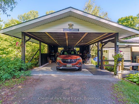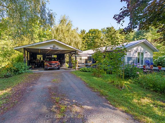 Welcome to this thoughtfully designed bungalow that offers the ultimate in one-floor living, perfectly tucked away on just under an acre of flat, usable land. Nestled off a quiet street with minimal traffic, this home combines peace and privacy with unbeatable convenience just minutes from Highway 11 and the vibrant town centre of Bracebridge.Step inside to find a well-laid-out floor plan with everything at your fingertips. The home features three generously sized bedrooms and two bathrooms, making it ideal for families, downsizers, or anyone seeking simple living without compromise. The kitchen is equipped with brand-new stainless steel appliances, offering modern function with a touch of country charm. Practicality shines with a spacious oversized mudroom, perfectly connected by a covered walkway to the 2008-built carport, which provides two covered parking spots and extra storage space.The full basement adds incredible versatility with a second bathroom, living room, and a unique layout that creates the perfect bonus space whether for guests, extended family, or your own lower-level den or hobby area. A newer metal roof (2019), two new heat pump units heat and cooling system, and mostly new windows throughout ensure peace of mind for years to come. Outdoors, the property is surrounded by mature trees, landscaped gardens, and level lawn space perfect for kids, pets, or simply enjoying the Muskoka lifestyle. With direct access to OFSC snowmobile trails, outdoor adventure is just beyond your doorstep.This home offers the perfect blend of comfort, convenience, and charm whether you're looking to downsize, start fresh, or settle into a simpler way of life just outside of town.