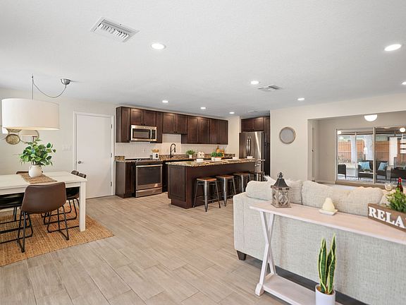 Step inside to discover a spacious split-bedroom open floor plan that has been thoughtfully updated throughout. The heart of the home is the designer kitchen, which features a large central island perfect for gathering, rich wood cabinetry, granite countertops, beautiful backsplash, a complete stainless steel appliance package, and ample storage. It opens to a bright and inviting living and dining area, creating an ideal layout for entertaining or relaxing with family.