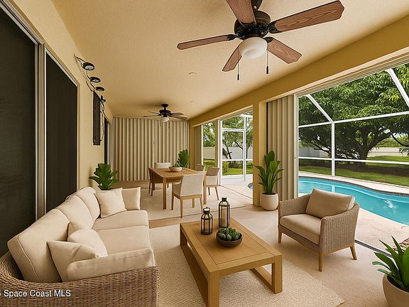 Welcome to your private tropical oasis! This beautifully maintained single-story home blends comfort, style, and peace of mind. Designed for effortless Florida living, it features accordion shutters throughout, a whole-house Generac generator, and a fully enclosed back porch with accordion sliders to protect your outdoor space year-round. Inside, vaulted ceilings and tile floors create a bright, open feel. The spacious kitchen offers a gas stove, Formica countertops, and a sunny breakfast nook, with a nearby laundry room and pocket office. The primary suite includes vaulted ceilings, pool access, his-and-hers closets, and a granite double vanity bath with a walk-in shower. Step outside to your tropical paradise with a sparkling pool, lush landscaping, and fruit trees including mango and starfruit. Mature oak trees add shade and charm. With built-in garage storage and included washer/dryer, this home offers beauty, function, and true Florida living!