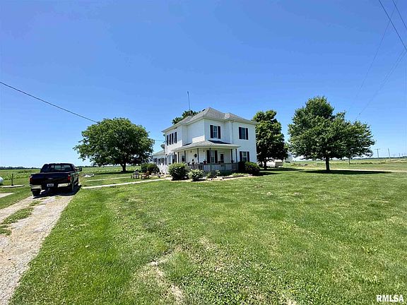4-5 bedroom Triopia farmhouse. Replacement windows. Roof approximately 6 years old. Hardwood under carpets on main level. Rural water from Jacksonville. Spacious eat-in kitchen. Wrap around front porch. 4,000 sq ft machine shed. 2.33 acres.