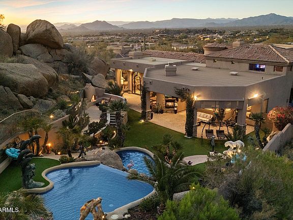 Tucked in a private cul-de-sac on 2.6 acres, this custom Pinnacle Canyon home delivers tropical, resort-style vibes w sweeping mountain preserve views & 17th tee box of the famous Troon North Golf Course. Built into the boulders! Recently updated w exterior paint & a NEW ROOF (2025), it features arched windows & doorways, designer lighting, travertine flooring, & a dramatic fireplace. Chef's kitchen includes two-tone cabinetry, a butler's pantry, upgraded finishes, & a built-in bar w a two-way fireplace. All bedrooms have private balcony access w the exception of one. Head upstairs to the oversized primary suite offering two balconies w stunning views. The primary bath boasts a spa-style bath with a wet room, reclaimed wood vanities, copper soaking tub and dual cedar closets. The backyard is built for entertaining, featuring two pools, a hot tub, a fire pit, outdoor fireplace, turf, built-in grill, new pool equipment, and a wraparound patio. Additional highlights include a 2-car garage with 2 lifts and epoxy floors, a separate 1-car garage, 2 AC units, and 2 water heaters. Located in one of North Scottsdale's most exclusive gated golf communities.