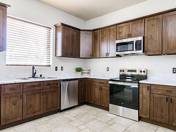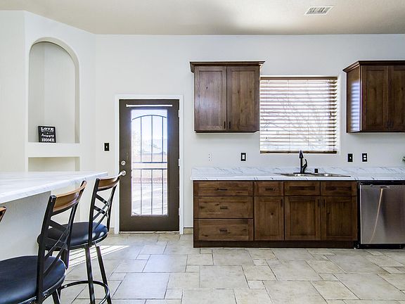 Welcome home! What a fantastic home in NW Albuquerque. This 3 bedroom home w 2235 sq ft has no carpet downstairs & boosts updated decorative tile throughout lower level. The kitchen has recently been updated w countertops and cabinets & has ample counter/cabinet space, a pantry, breakfast bar & door to outside. Raised ceilings at 10' give the lower level added height. 2 living areas & seperate dining space. The oversized spacious owner's suite features double walk in closets & an ensuite bath w dbl sinks. 2 additional bedrooms & a full bath. Newer carpet throughout. Mountain VIEWS from upper level. Ceiling fans and AC refrigerated cooling. Conveniently located near parks, schools, CNM, hospitals, shopping & dining/breweries. No HOA or PID. Side yard access w a carport on side of home.
