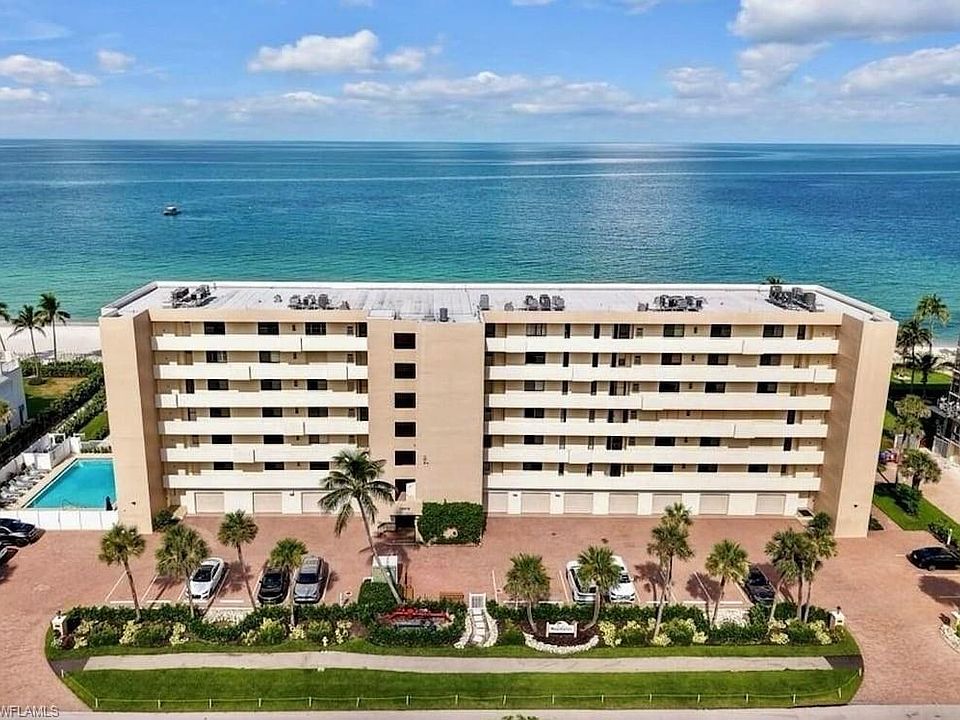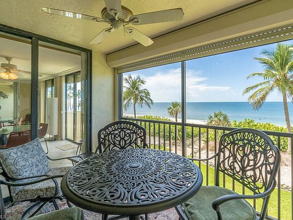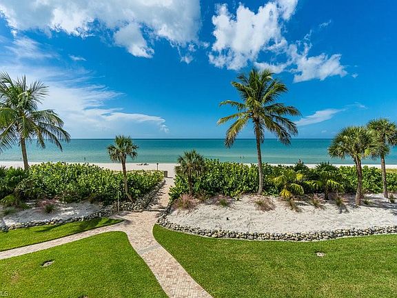 This Naples condo, “Bayshores of Vanderbilt Beach” sits directly on the Gulf, on Vanderbilt Beach—You cannot get closer to the Gulf! Bask on the beach, by the pool or on the lanai...or under an umbrella, with your condo 10 steps away. This is a 30-unit, quiet environment with a private beach, heated pool, tennis/pickleball court and stunning landscaping. This unit 122 is three flights up with 2 bedrooms and 2 bathrooms and is being delivered turn-key furnished, move-in ready condition, with a fully equipped kitchen and storage. Think of the most tranquil beach vacation you’ve ever taken and this surpasses it. Vanderbilt Beach is a well-kept secret and a perfect place to live or vacation…Walk to lunch or dinner at Baleen at La Playa resort or for a nightcap by the outdoor fires. This unit can be enjoyed as a personal residence or as a profitable rental property—or both. The unique bi-weekly rental policy allows for 14-night minimums or up to 26 leases per year. This building is one of the very few beachfront properties which allow rentals in Naples. This pristine 2 bedroom has an enormous living area, dining room and additional built-in office area, screaming fast WiFi, with 2 full bathrooms including a primary bathroom and dressing room with a walk-in closet. The updated kitchen has glowing stainless steel appliances, reverse osmosis (purified) water (no more hauling bottled water), granite counters, and fully equipped with a wide variety of cooking appliances and utensils. There is a heated outdoor pool overlooking the beach and Gulf, on-property dedicated parking spot right up front, and across the road is your tennis/pickleball court and auxiliary parking. Docks available for rent or purchase. The condo is renovated with a tropical feeling, overlooking the Gulf--you'll be thinking you've landed in Paradise. There are panoramic views of the ocean, palm trees and sunsets from every room--the primary bedroom is also on the Gulf so you can hear the waves on the beach while you sleep. The second bedroom has views of Wiggins Pass Lagoon and your tennis/pickleball court. The beach is groomed daily and always quiet because there are only 30 units in this building with 13 private homes adjacent to the property. You could nap on the lanai, after watching the dolphins and manatees in the Gulf. All hurricane shutters have been upgraded, the Impact glass replaced, and the building has already accomplished it’s Milestone Inspection and Structural Integrity Reserve Study.