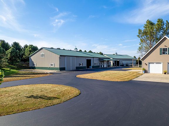 This mixed-use property in Winnebago County has so much to offer, with a beautiful country home, multiple outbuildings, and a scenic blend of timber and pasture. As you come up the long blacktop driveway, the home and buildings sit prominently on the hilltop, giving you panoramic views in every direction. The inviting wrap-around porch sets the stage for the lifestyle this property provides, combining comfort, function, and wide-open space. Step inside the home and you’re welcomed by an open entryway that leads into a spacious family room featuring vaulted ceilings and a wood-burning fireplace as the centerpiece. The oversized kitchen is perfect for hosting with an abundance of cabinet space, a large island, and a connected dining area. A flexible front room can serve as a living room, den, or formal dining room depending on your needs. On one wing of the main floor sits the massive master bedroom with its own bathroom and walk-in closet. Another main-level bedroom, currently used as a den, has access to a full bath. On the opposite wing, you’ll find a convenient first-floor laundry room, pantry, and half bath. Upstairs are two more oversized bedrooms, each with walk-in closets, and a full bathroom. The partially finished basement offers high ceilings, tons of potential for more living or recreational space, and direct access to the attached three-car garage. The garage is designed with practicality in mind, large enough for daily vehicles with an oversized door that’s perfect for a side-by-side or larger equipment. Next to the home sits a 54’x112’ outbuilding with multiple overhead doors of varying sizes, a concrete floor, and heavy-duty racking. Part of this building has been set up as a climate-controlled shop, making it a highly versatile space. A 54’x60’ stable provides three horse stalls with direct access to pasture, a gravel base, and sand flooring for durability and easy maintenance. The 10-acre setting offers a perfect balance of usable space and natural beauty. Approximately 1.3 acres of fenced pasture are ideal for horses, livestock, or recreational use, while the remaining acreage features mature timber that provides privacy and a serene wooded backdrop. The property offers room to expand gardens or create trails through the timber for walking, riding, or enjoying the outdoors. This smaller acreage retains all the charm and flexibility of a larger property while being easy to manage and maintain. All of this comes with the benefit of privacy and seclusion while still being conveniently located just off US-20, giving you quick access to surrounding towns and amenities. With an option to purchase additional acreage, this property can easily grow to meet your needs. It’s a rare opportunity to own a beautifully improved homestead in a setting that blends comfort, function, and natural beauty. *Can be purchase on 80 acres for $1,441,600*