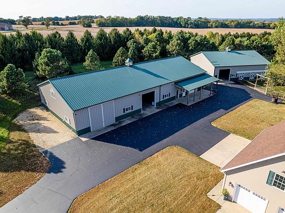 This mixed-use property in Winnebago County has so much to offer, with a beautiful country home, multiple outbuildings, and a scenic blend of timber and pasture. As you come up the long blacktop driveway, the home and buildings sit prominently on the hilltop, giving you panoramic views in every direction. The inviting wrap-around porch sets the stage for the lifestyle this property provides, combining comfort, function, and wide-open space. Step inside the home and you’re welcomed by an open entryway that leads into a spacious family room featuring vaulted ceilings and a wood-burning fireplace as the centerpiece. The oversized kitchen is perfect for hosting with an abundance of cabinet space, a large island, and a connected dining area. A flexible front room can serve as a living room, den, or formal dining room depending on your needs. On one wing of the main floor sits the massive master bedroom with its own bathroom and walk-in closet. Another main-level bedroom, currently used as a den, has access to a full bath. On the opposite wing, you’ll find a convenient first-floor laundry room, pantry, and half bath. Upstairs are two more oversized bedrooms, each with walk-in closets, and a full bathroom. The partially finished basement offers high ceilings, tons of potential for more living or recreational space, and direct access to the attached three-car garage. The garage is designed with practicality in mind, large enough for daily vehicles with an oversized door that’s perfect for a side-by-side or larger equipment. Next to the home sits a 54’x112’ outbuilding with multiple overhead doors of varying sizes, a concrete floor, and heavy-duty racking. Part of this building has been set up as a climate-controlled shop, making it a highly versatile space. A 54’x60’ stable provides three horse stalls with direct access to pasture, a gravel base, and sand flooring for durability and easy maintenance. The 10-acre setting offers a perfect balance of usable space and natural beauty. Approximately 1.3 acres of fenced pasture are ideal for horses, livestock, or recreational use, while the remaining acreage features mature timber that provides privacy and a serene wooded backdrop. The property offers room to expand gardens or create trails through the timber for walking, riding, or enjoying the outdoors. This smaller acreage retains all the charm and flexibility of a larger property while being easy to manage and maintain. All of this comes with the benefit of privacy and seclusion while still being conveniently located just off US-20, giving you quick access to surrounding towns and amenities. With an option to purchase additional acreage, this property can easily grow to meet your needs. It’s a rare opportunity to own a beautifully improved homestead in a setting that blends comfort, function, and natural beauty.