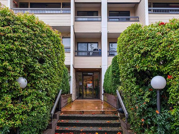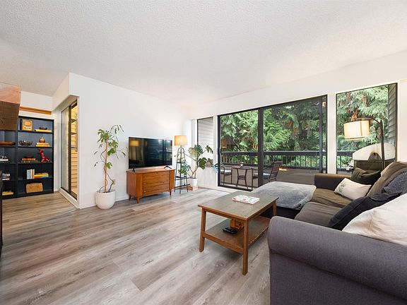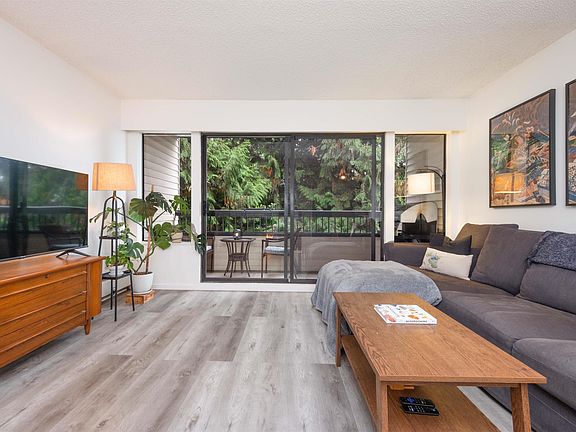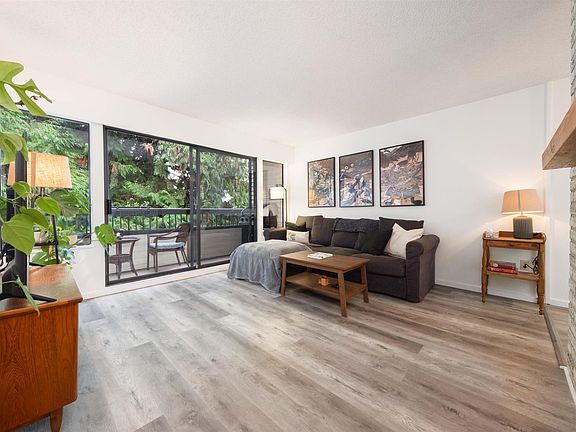 Welcome to Blue Mountain Manor! Feel the calm of nature from this large corner unit, 2 bed, 1 bath home perfectly set across from beautiful Blue Mountain Park. Wake up to the sound of birds, sip your morning coffee on the private balcony surrounded by cedars, and unwind by the cozy gas fireplace. Thoughtful layout with dining area, separate office nook, and large panty - rare in condo living! Updated flooring & newer full-size washer/dryer. Well-maintained, rainscreened building with new roof (2017). Heat, hot water & gas included. I parking & 1 locker.