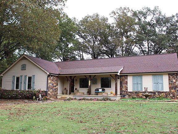 Tucked away on a scenic 4-acre lot, this welcoming one-level home offers 3BRs and 2BAs. Kitchen features tiled floor, backsplash, granite countertops, pantry, smooth cooktop, double ovens, and countertop microwave. The breakfast rm and 20x15.4 great rm both have hardwood floors, with great room centered around a stone fireplace plumbed for gas logs, w/built-in book and gun cases. BRs include 18x14.11 primary, 11x10.11 and 12.6x10.11 2nd and 3rd BRs, plus sunroom at the rear of the home for quiet relaxation. All rooms except kitchen and baths feature hardwood floors; laundry closet with built-in shelves. The property has scattered trees, fenced area for pets or play, extra parking. Double attached garage includes dog runs leading to covered exercise areas. 48.5x28.6 insulated metal building with a roll-up door is ready for projects, storage, or workshop needs. Covered front porch, stone and siding exterior for low maintenance, electric security gate. A peaceful and inviting retreat!