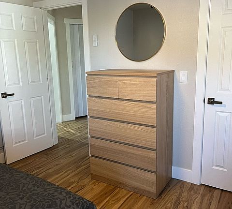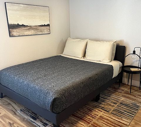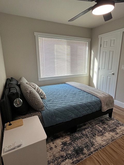 The bungalow features two cozy bedrooms each outfitted with a queen bed and mattress, a closet, a ceiling fan, and new double pane windows for tons of light. Blackout shades and door locks installed for privacy.