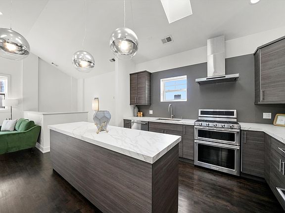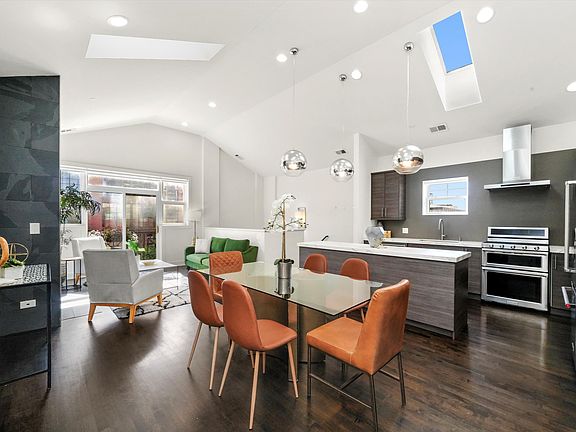 Spectacular, Sunny Penthouse in the Heart of Fulton Market! Top-floor 2 bed, 2 bath PENTHOUSE in the vibrant Fulton Market District with multiple outdoor spaces and incredible natural light! This highly upgraded home features vaulted cathedral ceilings, skylights, and panoramic views of the city and Fulton Market from the front balcony! The spacious, open floor plan is complemented by rich hardwood floors throughout and a modern gas fireplace. The chef's kitchen is beautifully appointed with Neolith countertops and extended island, stainless steel appliances, soft-close cabinetry, and an undermount farmhouse sink-perfect for cooking and entertaining. The extra-large primary suite includes a spa-like bath with a gorgeous standalone shower, skylight, and double vanity. Additional highlights include professionally organized closets, side-by-side washer/dryer, extra storage room, and garage parking-all included in the price. Outdoor space galore: enjoy a front balcony, rear deck, and access to a shared garage rooftop deck! Located just steps from renowned restaurants, bars, shops, parks, and the Green Line El stop. This is an incredible opportunity in an unbeatable location-don't miss your chance to enjoy the best of Chicago living! Explore the property in 3D! Click the 3D button to take a virtual tour and walk through every detail.