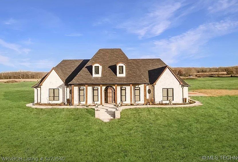 Custom home sitting on 117 acres outside of Sallisaw, OK . Chefs kitchen, office, stone fireplaces. Amazing primary suite.
