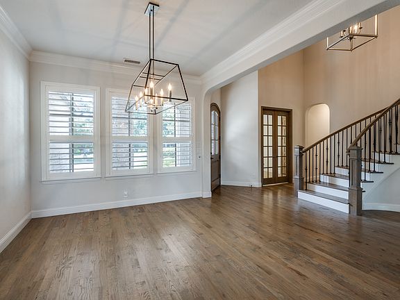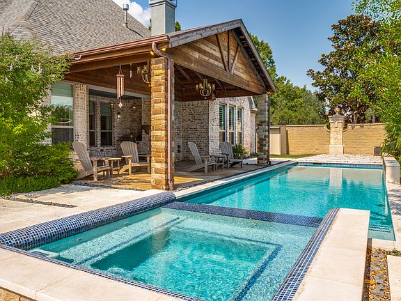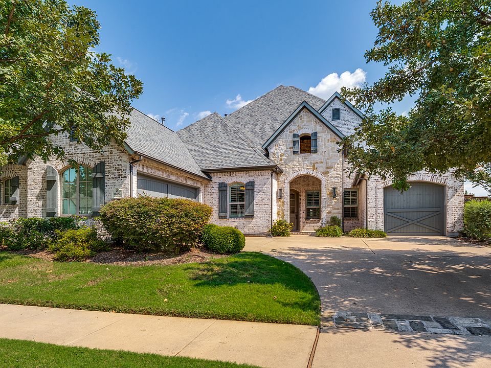 Welcome to this beautifully updated home in the prestigious gated community of Shaddock Estates, the only gated neighborhood zoned to top-rated Wakeland High School. This 4-bedroom, 4.1-bath residence features timeless curb appeal, transitional design, and a 3-car garage. Inside, you'll find extensive hardwood flooring, plantation shutters, and light-filled rooms designed for both everyday living and entertaining. The chef's kitchen is a standout with luxury Dacor appliances, a 6-burner gas cooktop, double ovens, a built-in GE refrigerator, oversized prep island, breakfast bar, and a custom buffet for added storage. The main living area offers cathedral ceilings, a gas fireplace, and picturesque views of the private backyard oasis. The first-floor primary suite is a serene retreat with dual vanities, a freestanding soaking tub, and a spacious walk-in closet. A dedicated media room is also located on the first floor for convenient access and comfortable movie nights. Upstairs includes a game room and a private bedroom with full bath, ideal for guests, in-laws, or a teenager's dream suite. Each bedroom features its own bathroom for added comfort and privacy. Step outside to a resort-style backyard with a sparkling pool and spa, a large covered patio, built-in grill, outdoor fireplace, and plenty of grassy space to relax or play. Shaddock Estates offers a quiet, family-friendly setting surrounded by Cottonwood Creek Park's 68 acres of trails, lakes, pavilions, and a stocked fishing pond. Enjoy a prime location just minutes from the PGA Headquarters, The Star, premier shopping, dining, and easy access to the Dallas North Tollway. Pool maintenance and HOA dues are paid by the owner, making luxury living even more effortless.