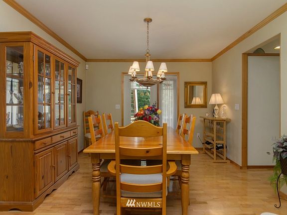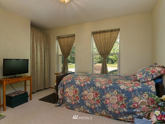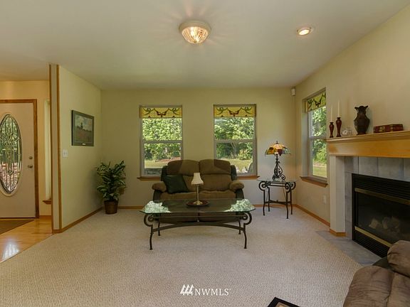 Totally private wonderful 4 BR home on 5 acres (4 of them wooded) just outside Bellingham. Circular entry, Cape cod style has separate LR and FR. Gourmet kitchen w/pantry, cooking island, lots of cabinets. Hdwd floors, gas & wood f/p, den/office...space for everything! Two patios, a hot tub and level play yard. Circulating hot water, cement-board siding, security and more. Private well. Landscaped grounds.
