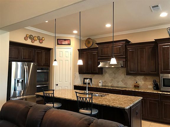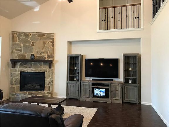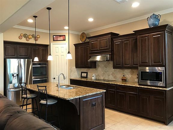 Beautiful Highland Home in Devonshire. 4 car garage with large attic storage with sub-floor. Built-in large registered-certified tornado-safe room. Two very large secondary bedrooms upstairs each with full private bathroom. Large master suite includes jetted tub, separate large shower, double sinks, separate vanity counter and huge walk-in closet. Very large family room with soaring ceiling and beautiful stone fireplace. Oversized kitchen with granite counters, stainless appliances, smooth top stove and double oven. Expanded laundry room with granite counter, sink and cabinets. Backyard has large covered patio, mature trees and a large spa building on concrete pad, fully wired for future spa.