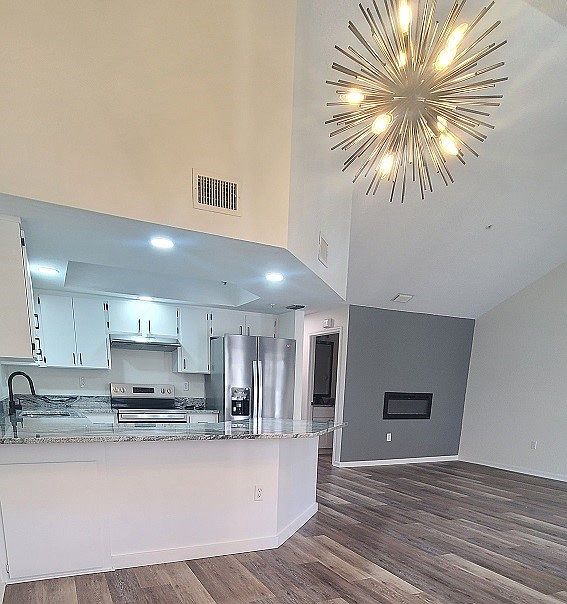 Modern fixturesOversized kitchen islandTile floorsMarble sillsCathedral ceilingsWalk-in rain showerStainless steel appliances