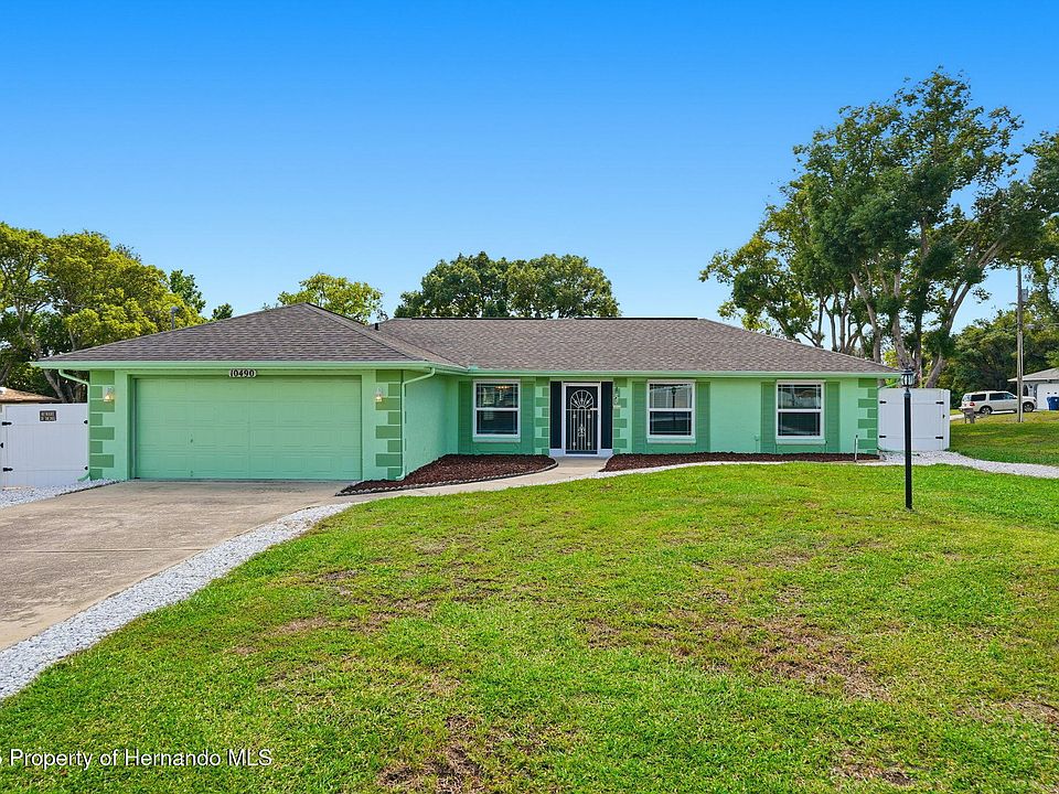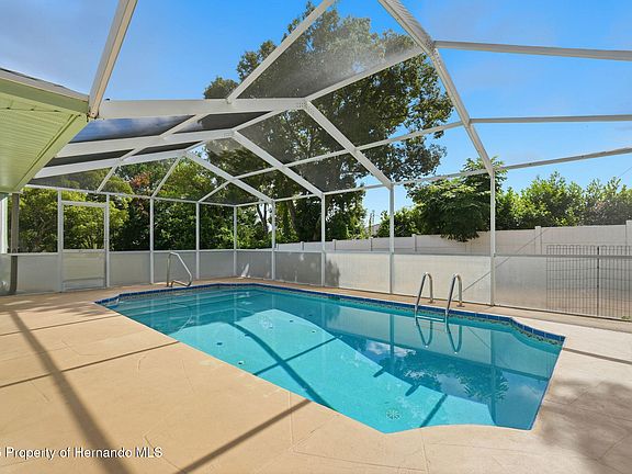 Immaculate 2-bedroom, 2-bath, 2-car garage pool home on a beautiful ¼-acre corner lot in one of Spring Hill's most desirable areas. Step through the double-door entry into a bright, open living and dining space featuring cathedral ceilings and skylights that fill the home with natural light. The spacious kitchen offers ample cabinetry, newer stainless steel appliances, and a cozy eat-in area overlooking the sparkling pool. The split-bedroom floor plan provides comfort and privacy. The primary suite includes a walk-in closet and an en-suite bath with a newly remodeled tiled shower and dual sinks. Sliding glass doors lead directly to the screened pool and covered lanai, complete with vinyl windows that transform it into an all-season room. Remove the windows to create the ideal indoor-outdoor space for entertaining. The new vinyl privacy fence encloses a large backyard with plenty of space beyond the pool area. Major updates in recent years include roof, A/C, windows with hurricane shutters, stainless steel appliances, water heater, vinyl plank flooring, vinyl fence, and primary shower. A perfect blend of comfort, style, and peace of mind—this move-in ready Spring Hill pool home is one you don't want to miss.