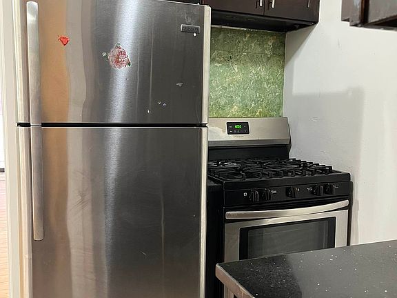 Apt has pergo wood flooring semi open kitchen with good top and bottom cabinets with stone counters. Stainless steel appliances.
