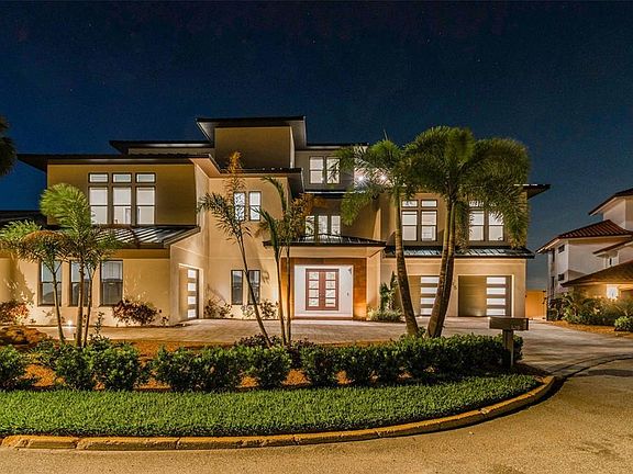 A modern coastal masterpiece, thoughtfully engineered for enduring elegance and the ultimate waterfront lifestyle. Constructed totally custom in 2022, offering 4 bedrooms, 4 full baths, 2 half baths, over 5,500 sq ft of air-conditioned living space, and more than 10,700 sq ft under roof including expansive patios and a 3,500 sq ft air-conditioned garage with a professional quality gym on the ground level. Designed for long-lasting ownership and true peace of mind, the home is constructed with concrete block on the first level, a ZIP wood system for upper floors, over 59 pilings tied to the full footer system, hurricane-impact PGT windows and sliders, spray foam insulation on all exterior walls and roof, plus batt insulation for interior sound reduction. An aged bronze standing seam metal roof, whole-home Generac generator, twin tankless propane water heaters, and a 500-gallon buried propane tank add durability and resilience. Inside, no detail was overlooked — European oak wide-plank floors run throughout, complemented by Porcelanosa tile in all bathrooms and main laundry. Every door features Baldwin solid brass handles. The gourmet kitchen is outfitted with Sub-Zero and Wolf smart appliances, dual 11-ft islands with waterfall edges, custom Busby cabinetry with accent lighting, a separate pantry, and a dedicated coffee bar. All countertops throughout are Cambria quartz with lifetime chip repair. The primary suite is a true retreat with a private office and an additional flex room along with a spa-like bath featuring a huge no-threshold shower with linear drain, freestanding tub, custom vanities, built-ins, and electric privacy screens. The home includes a SONOS wireless sound system, Lutron Caseta smart dimmers, and automated Hunter Douglas window treatments throughout. Outdoor living is resort-inspired with multiple lanais and decks finished in ¾” porcelain tile, a PebbleTec pool with white travertine coping, dual in-pool spas with Pentair automation, Shawgrass artificial turf, triple built-in umbrellas, and a fully equipped dock with a 20,000 lb boat lift, additional lift for smaller watercraft, full-length aluminum walkways, under-dock blue lights, and dedicated power and water at every slip. The oversized garage (up to 10 cars) features a dedicated A/C unit, epoxy floors, custom flake finish, a pro-grade gym with Rogue, REP, and Titan equipment, and a locking storage closet. This is a rare opportunity to own a true architectural gem where every detail from the structural engineering to the finishes was designed to deliver luxury, security, and the ultimate waterfront lifestyle. Offered fully furnished and move-in ready, contact us today to arrange your private appointment to discover the pinnacle of modern coastal living!