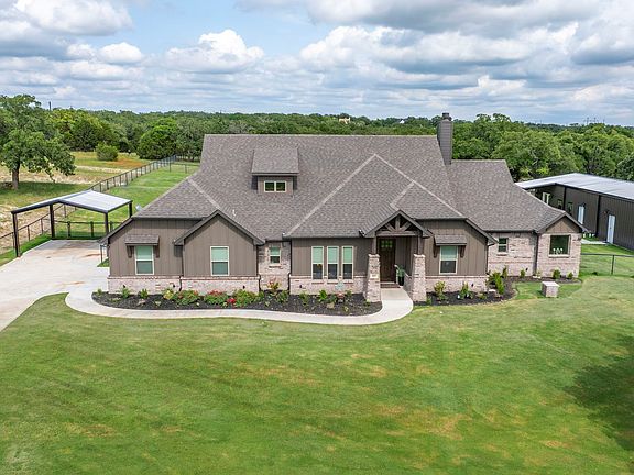 Stunning Country Home with Party Barn on 2 Acres in North Parker County, TX. This new and highly upgraded home sits on 2 pristine acres, surrounded by mature Post Oak trees. Great curb appeal and a long driveway set back from the street, this property offers both privacy and charm. Step inside to a spacious interior featuring an open floor plan, ideal for entertaining and everyday living. Just off the entryway is a dedicated office, perfect for remote work or study. The main living area has multiple windows that overlook the backyard and bring in abundant natural light. The thoughtfully designed split floorplan includes 3 bedrooms and 3 full bathrooms, allowing each bedroom to enjoy its own private bath. The home has been extensively updated in the past year with modern touches throughout, including a whole-home water filtration system, reverse osmosis at the kitchen sink, new built-in shelving, updated lighting, and updated cabinet hardware across the home. A major selling point is the massive party barn and shop space that adds an additional 1,000 square feet of heated and cooled living area complete with a secondary full kitchen and half bath, making it ideal for hosting guests, events, or creating a guest suite or home gym. There’s also a 20x25 workshop attached to the barn, on top of the houses already oversized two-car garage and two-car carport. Step outside and enjoy one of the two large porches overlooking 1.2 acres of fresh sod that has been laid, supported by a full sprinkler system covering more than an acre in both the front and backyard. The fully fenced and cross-fenced yard includes custom metal pipe fencing and gates in both the front and backyard perfect for kids, pets, or livestock. Whether you have horses or farm animals, the setup is ready for you. At the very back of the property there are huge Post Oaks, and a wet weather creek for your kids to explore! This rare chance to get into a turn-key property with all the extras already there!