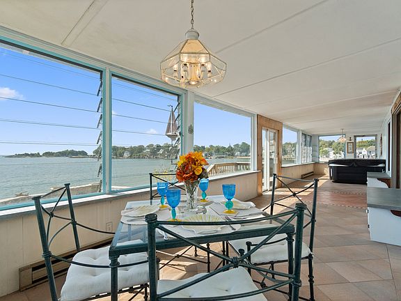 Wake up to sweeping 270-degree panoramic views of Granite Bay and Long Island Sound, where sparkling waters, scenic islands, and inviting beach areas stretch out before you. You might even catch the Yale Sailing Team at practice. The Wilcox Estates is a seven-unit condominium on a peninsula in Short Beach with some of the finest views in the shoreline area. Unit 105 is the first floor of the original Wilcox house. This well-maintained condo offers an open floor plan that maximizes both space and light, perfect for enjoying the serene beauty that surrounds you. The four-season porch has windows on three sides and a hot tub, making it enjoyable even in the winter. Step outside to a quiet lawn area (LIMITED COMMON AREA) ideal for morning coffee, sunset cocktails, or simply soaking in the tranquil waterfront ambiance. The kitchen was renovated nine years ago with all new cabinets, Stony Creek granite countertops, and stainless steel appliances, including a wine chiller. Even the kitchen boasts gorgeous views, complete with a counter to watch the sunsets. The rustic panelled living room has a wood-burning fireplace for chilly evenings. A large open deck (LIMITED COMMON AREA) faces south and west with beautiful water views all day long, with plenty of room for both a table and lounging. The unit comes with a detached, private two-car garage, the only one in this complex. Located just a short stroll from a charming, walkable downtown, you'll find local restaurants, a post office, and a true small-town coastal vibe, all just minutes from your front door. Easy commute to Yale and New Haven, and less than 2 hours to New York. Whether you're looking for a peaceful year-round home or a weekend escape, this property offers the best of shoreline living with carefree maintenance and those utterly captivating vistas.