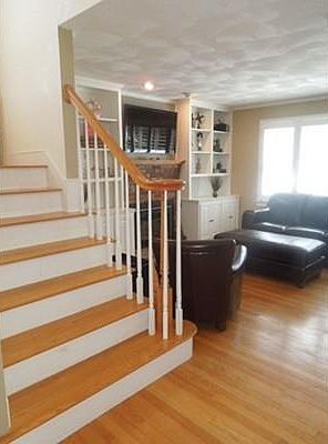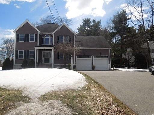 Stunning four bedroom Colonial with all the bells and whistles! Dramatic two storey foyer with 2 exquisite chandeliers greet you. Gleaming hardwood floors. Formal dining room with inlaid wood floor, box moldings and tray ceiling; formal living room with dentil moldings. The kitchen features stainless steel appliances, angled breakfast bar with pendant lights, recessed lighting and open to lovely dining nook with windows on three sides creating a sunny spot. The family room offers a brick hearth and built in bookcases and cabinets. The second floor offers 4 bedrooms including 3 with built in closets. The Master has a fabulous jetted tub with triple window overlooking the back yard as well as a separate shower. The level backyard has a stone wall backdrop and a storage shed. The two car garage has high ceilings and could accommodate large vehicles. Convenient to Rte. 3, 128 and 95.