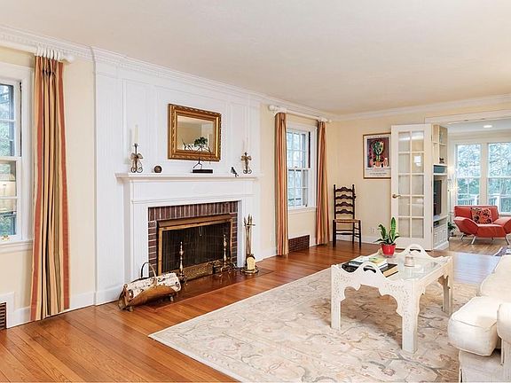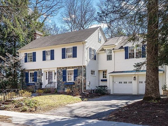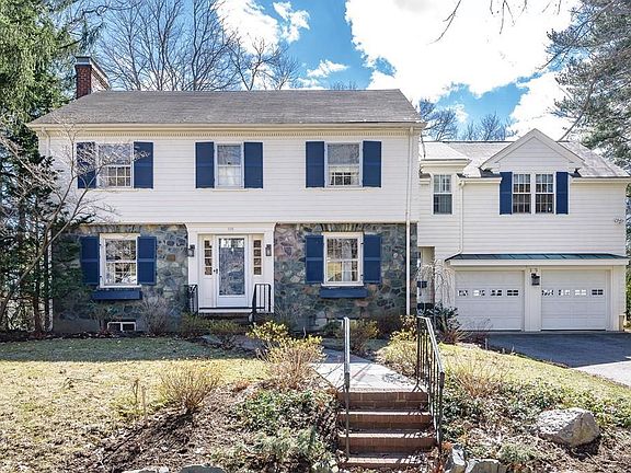 Stunning center-entrance Colonial on much desired tree-lined street. The foyer features a pretty turned staircase, dentil crown molding, and beautiful archways to a graciously-sized living room w/a wood-burning fireplace. There are French doors into the step-down family room with custom built-in cabinetry and a wall-of-glass with doors to the large deck and exquisite yard. The updated eat-in kitchen has white cabinets, granite countertops, center island, and lots of cabinet storage. The breakfast area has a skylight and pretty views of the garden. The dining room has a lovely corner china cabinet. The second level is comprised of a large en suite bedroom with a high ceiling, an updated hall bathroom, and a generously-sized second bedroom. The master bedroom suite begins with an office/den and leads into the wonderfully appointed spa-like bathroom with double sink and steam shower. Also featured are a lower level with finished family room and full bathroom, an oversized two-car garage.