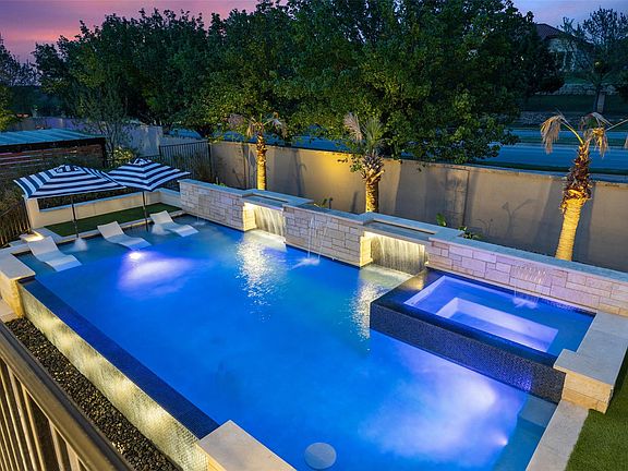 As the sun melts into the Hill Country horizon, you slip into the warmth of your reverse negative-edge pool, the glowing waters mirroring a sky painted in lavender, rose, and gold. This isn’t vacation—it’s everyday life at 105 Bisset Court, where resort living meets refined architecture in the prestigious Bluffs at Rough Hollow. Privately tucked at the end of a cul-de-sac with no neighbor behind, this home invites you to savor every moment—whether you’re sipping wine beneath the stars, grilling in the covered summer kitchen, or unwinding in the spa as waterfalls spill into the glowing pool framed by firelight and palms. Lounge beneath striped umbrellas on Baja shelves, gather by the fireplace in your courtyard, or retreat to the detached casita—perfect for guests, extended family, or creative flex space. Inside, a two-story great room with timbered beams flows into a chef’s kitchen featuring statement lighting, custom tilework, a generous island, and luxury appliances. Bold wallpaper, moody accent walls, and curated finishes bring character to every corner. The main-level owner’s suite offers garden views and a spa-worthy bath, while the dedicated office nearby makes working from home a pleasure. Upstairs, a media room, game room, and additional bedrooms complete the picture. Residents of Rough Hollow enjoy lake access, a private marina, yacht club, fitness center, hike-and-bike trails, resort pools, tennis and pickleball courts, social events, and a lakeside restaurant with breathtaking views. Located in highly rated Lake Travis ISD, this home is minutes from top-rated schools, boutique shopping, Whole Foods, golf, and fine dining at the Hill Country Galleria. Whether entertaining, relaxing, or simply living well, this is where luxury and lifestyle beautifully align—and every day ends with a sunset worth remembering. You’re not just buying a home; you’re stepping into a way of life that feels both effortless and extraordinary.