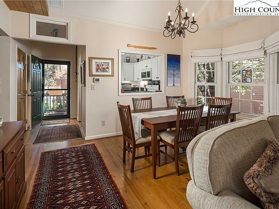 LOCATION! LOCATION! LOCATION! SPACIOUS, CONVENIENT 3 BEDROOM, 2 1/2 BATH TOWN HOME WITH ONE-CAR GARAGE NEAR TO ALL THE BEST OF BLOWING ROCK. Located in a surprising gem of a neighborhood of 10 townhomes, the owners have lived there full-time since the development was built. Just off Highway 321, next to the Blowing Rock Fire Department near to restaurants, grocery store and gas station and a mile from the heart of the Village with its shopping, restaurants, museums and churches. It is unsurpassed for convenience. Easy access to the home is two steps up to the front porch and one step up into the foyer. Upon entering the foyer one sees the sweeping high ceilings of the great room and the glass doors opening to the porch beyond. To your left is the light and bright kitchen. All appliances have been replaced within the past two to five years. A window overlooking the front porch with potted garden lights the kitchen. This compact kitchen with ample cabinets has turned out many fine meals. The great room has a bay window that illuminates the dining area with a large wooden table and chairs. A well-used space for festive meals. A stacked stone fireplace with gas logs warms the sitting area with couch and loveseat with coffee table between. A cozy space for conversation. All throughout the home the walls are covered with original paintings and special posters gathered from the owners many years living abroad. Go through the glass doors to the porch with its table and chairs for sitting and alfresco dining. From the great room enter the large primary bedroom with sitting area used for TV viewing. A gas stove warms the area on cold winter nights. There is ample area for a king bed and the back wall is filled with closets. There is an adjoining large bath with big shower and laundry room. From the great room enter the den/office with its triple window and door to the single car garage. In some of the New River townhomes this space is used as a dining room. Ascend the stairs from this room to the second level. There is a large guest bedroom with triple window and generous closet. A second bedroom serves as the owners well-equipped office, Across the hall is a bathroom with a tub/shower. Back down the stairs to the one-car garage which has served as a tool /hobby room for the owner. There are a number of shelves and cabinets that will remain with the house. Owner will leave many tools and equipment, if the buyer so desires.