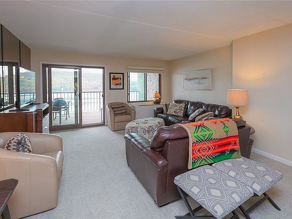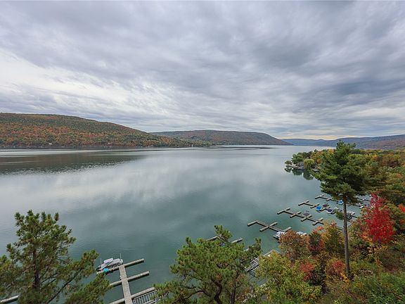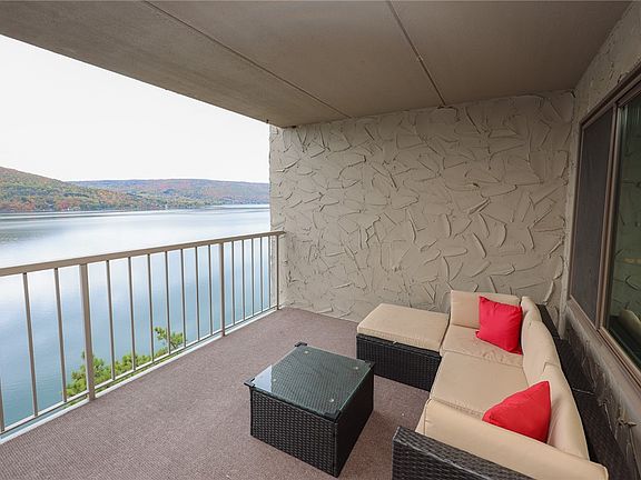 Lakefront resort living with maintenance freedom and low taxes. Breathtaking views from oversized, private balcony. Spacious studio condo (or easily convert to one bedroom). Large, open living area facing lake and hills. Easy walk to beach and marina. HOA fee includes: beach with chaise lounges, fire pit and grill; tennis and pickleball courts, community center with fitness room, gathering room, library, playground, basketball and picnic tables. Boat slips available for rent. Minutes from Finger Lakes wine and beer trails, golfing, restaurants, Bristol Mountain and area amenities.