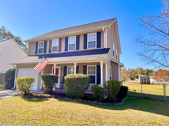 Welcome home to Coral Ridge subdivision in Richlands, where you'll discover this 4-bedroom/2.5-bathroom home nestled away on a large, maintained lot. Enjoy NO HOA and NO city taxes here! Upon entry, you'll take notice of the spacious downstairs living area, accented with brand new waterproof luxury vinyl plank (LVP) flooring. The kitchen offers stainless steel appliances, a bar top for extra seating or stools, multiple cabinetries, an eat-in kitchen dining area, and adjacent formal dining room. Upstairs is where you'll find the four ample-sized (and freshly painted) bedrooms. The first full bathroom boasts dual-vanity sinks, newer fixtures, and a shower/tub combo. Across the hall is the primary bedroom, featuring two closets and en-suite bathroom with two large windows, dual-vanity sinks, and a shower with oversized soaking tub to melt away the stress after a long day. On the back deck, you can soak up the sun's rays in the summer, brush up on your grilling skills, or relax with company and guests. The fenced yard provides added security for children and pets. The covered front porch provides shade during the warm months, where you can rock away in chairs and become engrossed with a good book. Need extra storage? No problem! Between the garage AND shed, you'll have space for your vehicle, lawn tools, lawn vehicles, workout equipment, planting supplies, and more. A short driving distance away are local schools, restaurants, the hospital, OAJ Airport, beaches, military bases, grocery stores, shopping centers, and county parks. The home has been professionally cleaned and is ready for its new owners. Call today to schedule your showing!