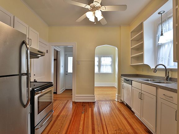 Charming home with hardwood floors! Gas heat, central air! remodeled baths! kitchen with range, refrigerator and dishwasher! 1st floor laundry! bedrooms are generous sized! excellent condition, front porch, fenced yard! Tenant pays own gas, electric, and water. 1st floor laundry, 2 car garage with opener, hardwood floors, ceiling fans, nice porch and backyard. Available now