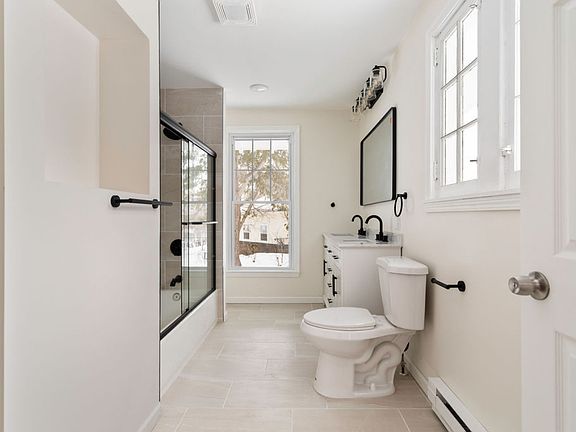 Modern Bathroom: Featuring a double vanity with quartz countertops, matte black fixtures, updated lighting, and a luxurious tiled tub/shower with sliding glass doors.