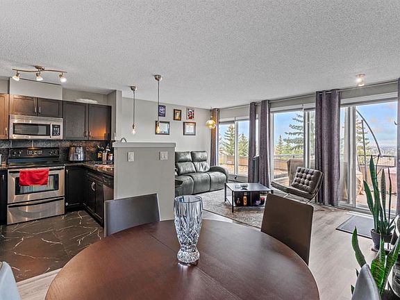 Welcome to “The News” – one of Calgary’s most sought-after complexes, nestled in the desirable community of Patterson. This BEAUTIFULLY UPDATED multi-level condo offers the perfect blend of COMFORT, FUNCTIONALITY, AND STYLE, - complete with stunning PANORAMIC CITY VIEWS. Inside, you’ll find 2 SPACIOUS BEDROOMS and 2 FULL BATHROOMS, thoughtfully designed across an open-concept floor plan that’s bright and inviting. The MODERN KITCHEN features rich dark wood cabinetry, GRANITE countertops, STAINLESS STEEL appliances, and stylish pendant lighting — ideal for both everyday living and entertaining. The breakfast bar opens seamlessly into the generous living and dining areas, enhanced by LARGE WINDOWS that fill the home with natural light. Unwind in the cozy living room beside the wood-burning FIREPLACE, or step onto your PRIVATE BALCONY to enjoy skyline and treetop views. Both bedrooms are generously sized with ample closet space and offer access to a SERENE LOWER PATIO surrounded by greenery — a perfect outdoor retreat. Additional highlights include UPDATED FLOORING throughout, a FULLY RENOVATED bathroom with modern finishes, IN-SUITE laundry, and ASSIGNED HEATED UNDERGROUND PARKING, plus extra assigned STORAGE. Residents of The News enjoy exceptional ON-SITE AMENITIES including a fitness centre, indoor pool, hot tub, tennis court, and recreation room. Surrounded by mature trees and walking paths, this quiet and well-maintained complex offers quick access to downtown, the river, transit, parks, and shopping. Experience an unmatched lifestyle in one of Calgary’s most desirable locations – book your private showing today!