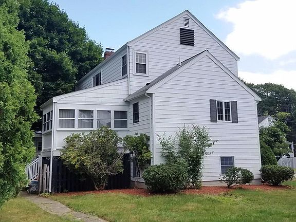 Expanded 4 bedroom, 2 bath corner lot Colonial welcomes you with open arms. Entire home features original hardwood floors on both levels. There's an easy flow footprint on the first floor. Large living room with working wood burning fireplace leads into a bright dining room overlooking the backyard, complete with 2 built in corner china cabinets. Continue into the cook's modern eat in kitchen addition with tile floors & stainless appliances. A full bathroom completes the remodel. The sunny three season porch is just a step off the kitchen. Upstairs has 3 bedrooms plus a huge master with 3 closets (1 cedar). A retro style refurbished bathroom finishes the floor. The walk up attic has tons of space for storage, & includes a whole house fan. The basement level has a large finished playroom/office/workout room, laundry area and leads into the garage, which has an additional storage room. Outside is a good sized fenced in yard, perfect for playing in. Great commuter location.
