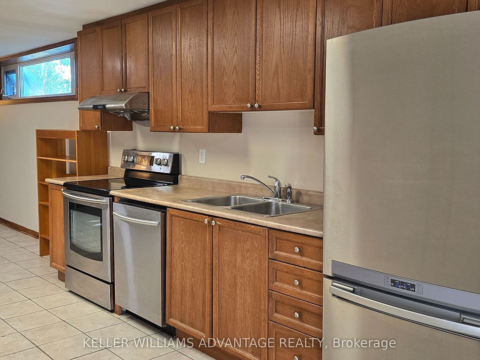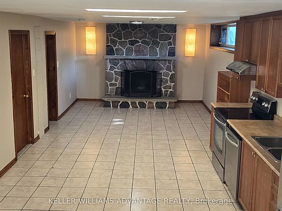 Sun Filled & Spacious two bedroom lower level apartment with approximately over 900 sq ft of space. Featuring Large combined living and dining room with wood burning fireplace. Open concept kitchen with modern appliances, including dishwasher. Tons of natural light provided via 10ft Wide window. Excellent location, near schools, transit, subway, parks and shopping. Enjoy the convenience of separate ensuite laundry and private entrance. Freshly painted with high ceilings.