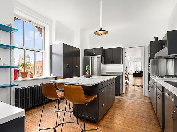 Located at the famed Powell Building in the Tribeca West Historic District, one enters this loft home through a key-locked elevator and discrete foyer that opens to an expansive great room. Upon entering, one will immediately notice the high loft-like ceilings. This corner great room has 11 enormous windows highlighting three exposures. Beyond the great room is the spacious and newly renovated chef's kitchen, which features stainless steel appliances, extensive custom designed cabinetry, stone countertops, and both northern and southern exposures.