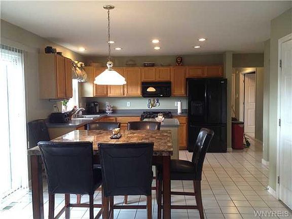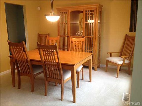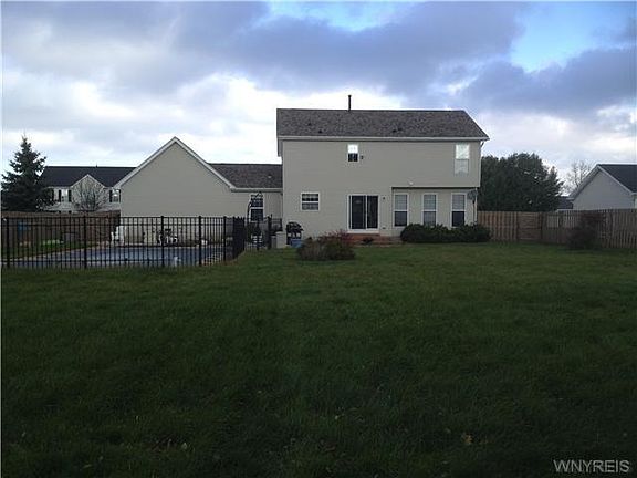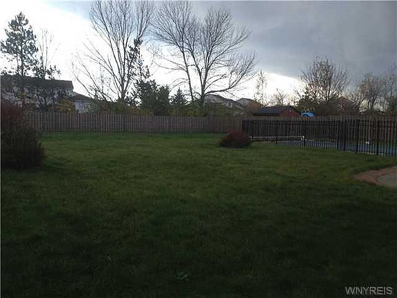 Brick front center entrance Colonial. Dramatic 2 story foyer. Formal liv and dining rms. Bright open kitchen with oak cupboards and ceramic tile floor,island and pantry.Sliding doors lead to great fully fenced yard with stamped concrete patio w/ Colley pool and spa. 1st floor laundry. Den with double doors. Master bdrm w cathedral ceiling , walk in closet and full bath. New architectural shingle roof 2014. Many rooms have been freshly painted. Demand location with highly rated Orchard Park schools. Priced lower than neighborhood. Gain some quick sweat equity.