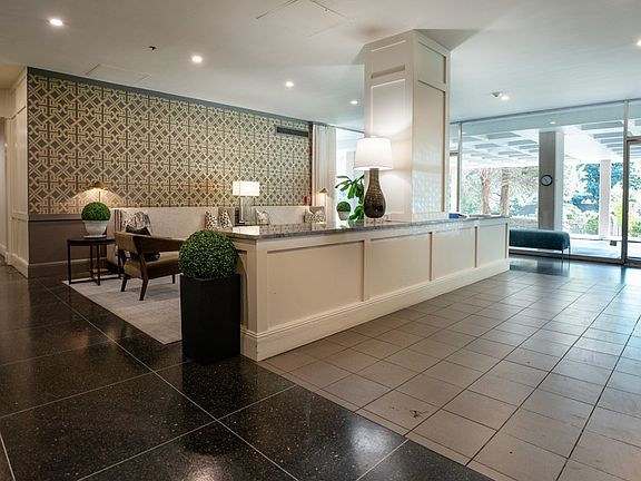 High-rise condominium situated on spacious grounds with a pool. This top floor unit faces the southeast with 675 sf of wrap around terraces. 2 bedrooms and 2 baths with roomy living room, den, and dining room. Doorman on duty 7 days a week. Unit comes with one covered parking space in the attached garage. No pets. Sold As-Is