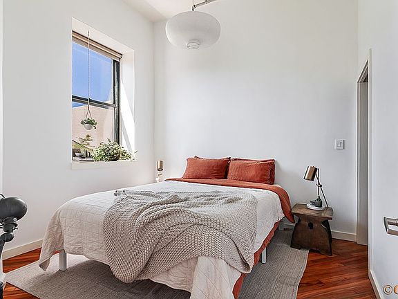 This unique loft sits on the Clinton Hill / Bedford Stuyvesant border. The loft is located on the second floor of a converted 1930s box factory. This home is not your typical white box; it is sun-splashed and has 12-foot ceilings with hand-crafted, industrial details throughout. The 1100 sq ft loft is currently configured as a 2-bedroom with an office alcove, plus an upper sleeping loft. The flexible, open plan can be tailored to fit all your needs.