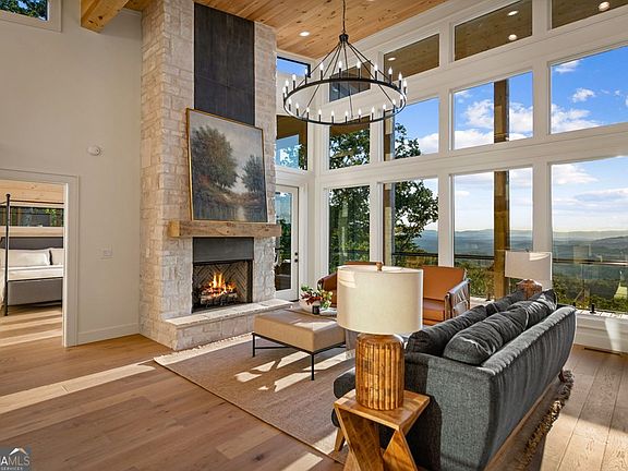 New Construction, mountain modern featuring some of the most spectacular views in all of North Georgia. Designed for both luxury and entertaining, this 4-bedroom, 4-bath residence features en suite bathrooms for every bedroom and dramatic architecture that maximizes its setting. Step inside to a wall of windows and floor-to-ceiling glass that frame endless layered mountain vistas. Modern glass railings with a built-in bar top keep sight-lines unobstructed and create the perfect space for gathering with family and friends. The open kitchen is a showpiece with custom cabinetry, upscale appliances, a gas range, and a spacious dining area. The main-level primary suite offers a stunning retreat with an accent wall, oversized windows, dual vanities, a custom tile shower, soaking tub, separate water closet, and a walk in closet w/ laundry hookups. A second main-level suite includes a large ADA bathroom with double vanities, custom tile shower, and direct access to the porch. Outdoor living is unmatched with two exterior fireplaces, multiple covered porches, and a spiral staircase leading down to a third-level terrace designed for games and gatherings. The finished terrace level adds another great room with fireplace, a sleek modern wet bar with wine cooler, a second laundry area, and two additional en suite bedrooms. Beautiful stonework, abundant storage, and thoughtful design throughout make this new construction an exceptional mountain getaway, or high-end rental opportunity.