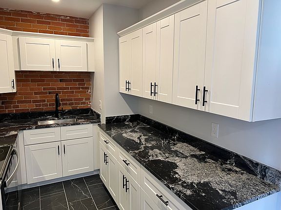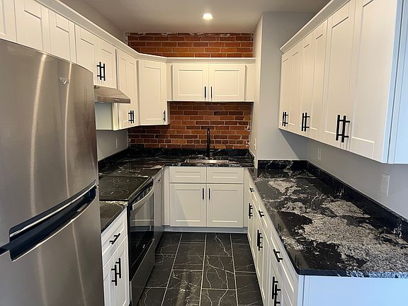 - Kitchen with stainless steel appliances, dishwasher, and black stone countertops located off of the living room.